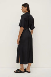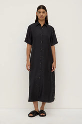 The Amelie Shirt Dress in black is a maxi shirt dress made from 100% silk, featuring a button-down front, waist tie, and side splits.