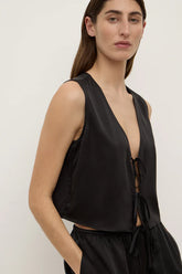 The Beal Silk Tie Front Top in black is a lightweight cropped top, crafted from 100% silk, with a V-neckline and tie-front detail.