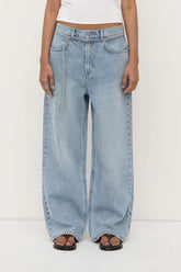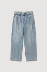 Our Loose Fit Jean in mid stone wash is a relaxed silhouette that provides shape through the waist with the removable tie belt. Designed to sit mid rise, they offer a loose fit through the leg.