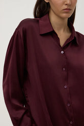The Pippa Silk Shirt in merlot is a relaxed fit collared shirt made from 100% silk, featuring mother-of-pearl buttons, sleeve plackets and a centre back seam.