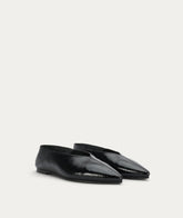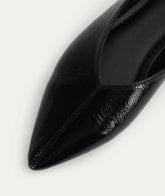 Epona Flat in Black is crafted from glossy Patent Calf Leather, with a contrast Lamb Nappa back and lining, LWG-certified. Featuring a signature pointed toe, tapered heel, and padded fixed insole. Designed for versatility, the back can be folded down to transform the style into a slip-on.