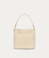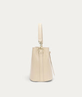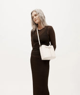 Mr Penny in Procelain reimagines the classic bucket bag in supple LWG-certified Ironed Calf Nappa with solid brass hardware. Featuring leather detailing threaded through brass eyelets, a detachable top handle, adjustable strap, and a removable cotton pouch.