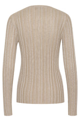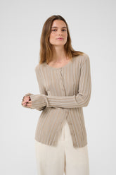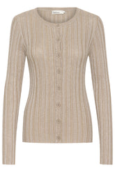 Made from a fine knit blend of 72% viscose, 15% polyamide (PA), and 13% polyester (PES), the Ulima Cardigan features a timeless crew neckline, button placket, and tonal seam detailing. With long sleeves and a narrow fit, this normal-length cardigan offers a sleek silhouette. The striped pattern in ivory and chamois adds a subtle, elegant contrast, making it a versatile wardrobe essential.