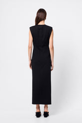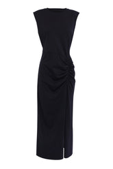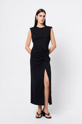 A modern interpretation of effortless sophistication, the Solide Midi Dress in Black brings refined simplicity to everyday dressing. Crafted from a soft, structured fabrication, this sleeveless silhouette features a crew neckline, padded shoulders for definition, and an asymmetric ruched detail that flatters the waist. A front side split adds subtle allure, balancing ease and edge. Designed for versatility, this piece transitions seamlessly from day to night — pair with minimalist accessories for a polished, contemporary finish.