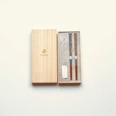 Presented in a paulownia wood box with a foil-stamped logo, this gift set features two pairs of "TSUGI" natural wood chopsticks inspired by the Japanese kintsugi technique, which mends ceramics with gold to highlight their flaws. Their sleek, refined shape and radiant gold seam elegantly enhance the feel in your hands. Crafted from natural wood, the chopsticks include non-slip tips and are dishwasher safe for practical use.