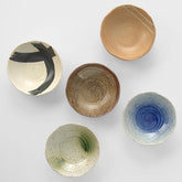 Featuring 5 uneven shallow bowls in an assortment of organic assorted glazes and patterns. Made of 'Minoyaki' porcelain, fired at a high temperature and hand finished in Japan.