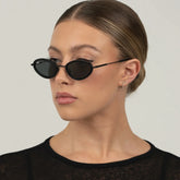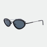 This slim oval frame pairs a glossy black plastic body with a subtle black metal rim, creating a refined balance of modern style and timeless appeal. Paired with smoke lenses, it’s a versatile choice for effortless day-to-day wear.
