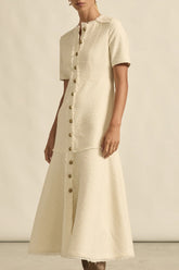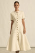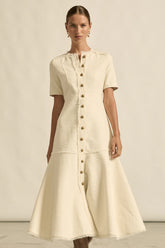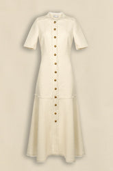 The dome shank brass buttons bring a refined contrast, elevating the round neckline and structured bodice.
