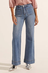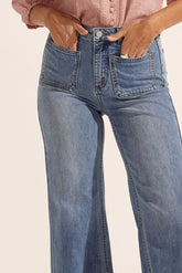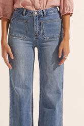 Channelling vintage yet chic flair the theory jean has been reimagined for today's modern woman. A wide leg is finished with a deep hem stitch and squared off front pockets add a slightly retro yet playful element. See product details below.